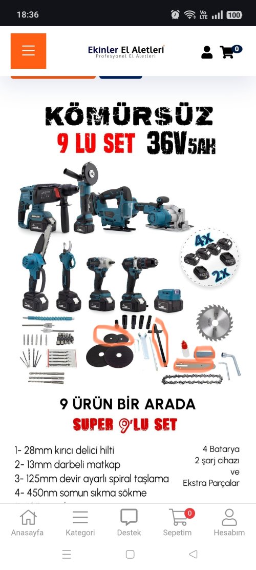 Parçalar :1 adet makine kutusu, 1 adet sunta kesme, 1 adet somun sıkma , 1 adet taşlama , 1 adet hilti, 1 adet vidalama matkap, 1 dal budama testeresi, 1 adet dal budama makası,  1 adet dekupaj, 1 adet  powerbanklı led aydınlatma, 4 adet batarya , 2 adet şarj cihazı , Ek Parçalar