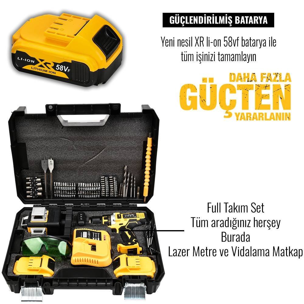 Devolt EEA257 Akülü 58vf Lazer Terazi ve Vidalama Matkap Seti (Sarı)
